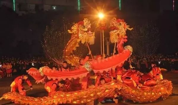 傳統(tǒng)的舞燈龍非常熱鬧,前有二至四對排燈開道,標明此燈龍是哪個村寨或街道的巨龍,排燈后還有魚、蝦和蚌殼、燈籠等,在鑼鼓、號角聲中晃頭擺尾,暢游各街頭巷尾,引得眾人圍觀。
