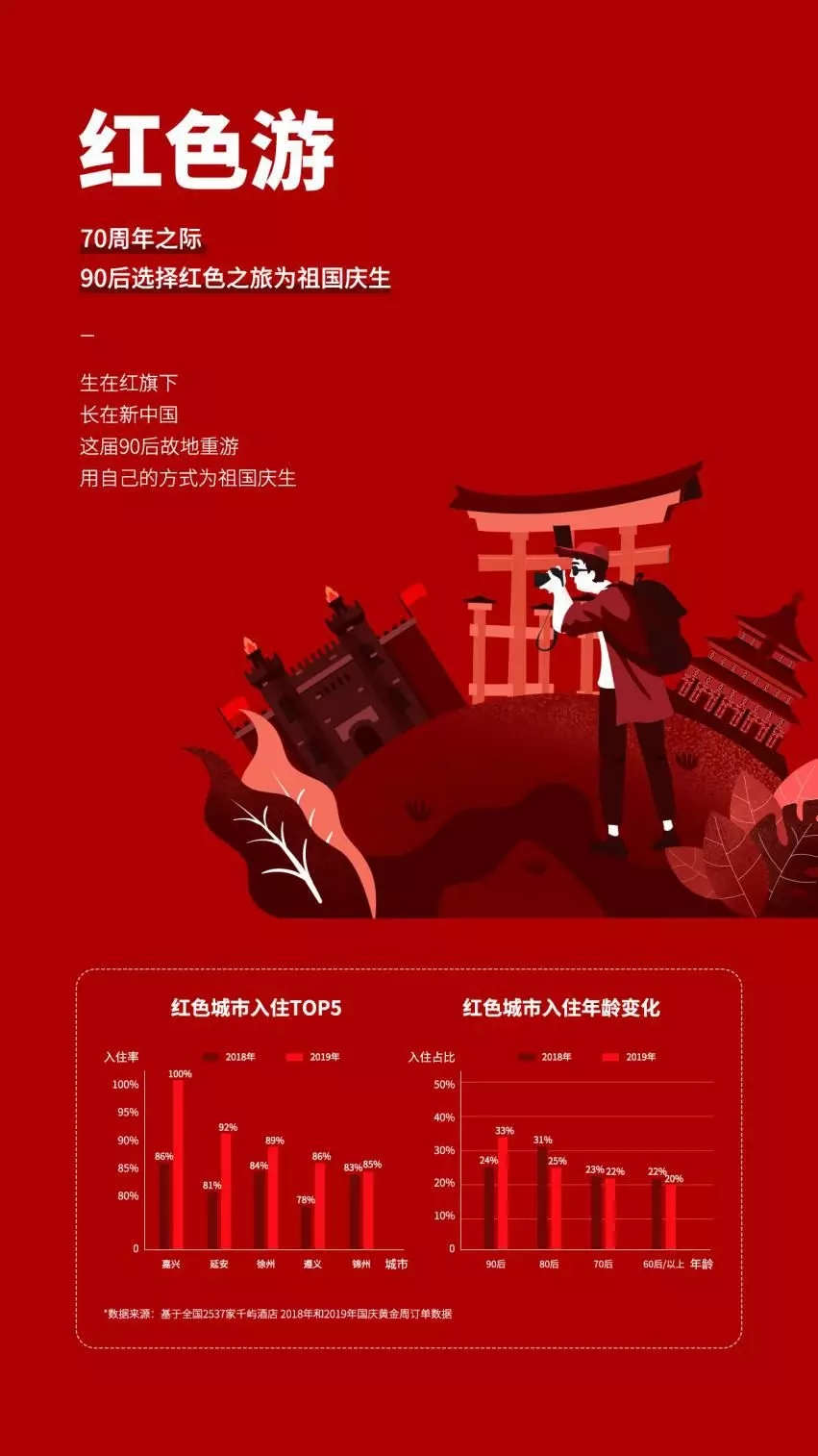 另外,在低線城市布局了2000多家酒店的連鎖酒店品牌“千嶼”近期也發(fā)布了一組數(shù)據(jù),恰逢建國(guó)70周年,紅色旅游受追捧刺激了低線城市旅游市場(chǎng)的繁榮。根據(jù)千嶼數(shù)據(jù),延安、嘉興、徐州、遵義、錦州等紅色城市成十一假期最受追捧的紅色旅游城市,國(guó)慶7天小長(zhǎng)假期間酒店平均入住率均維持在85%以上,嘉興更是成為最快滿房城市,國(guó)慶到來(lái)前3天就已經(jīng)有酒店迎來(lái)滿房狀態(tài)。而在這波愛(ài)國(guó)紅色游的熱潮中,90后超越80后成為新的主力軍,以33%的客群占比拔得頭籌,80后以25%的占比緊隨其后。