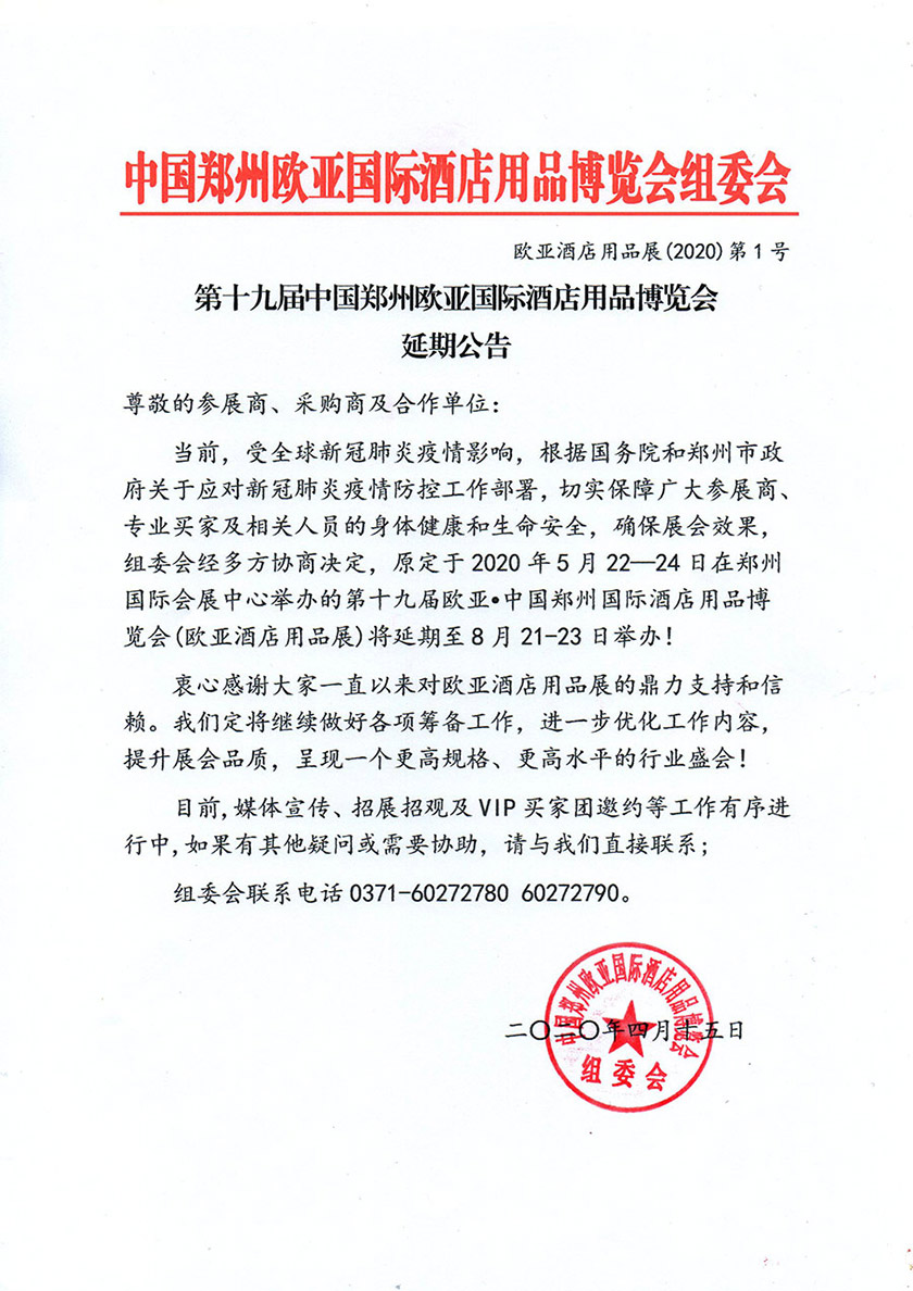 第十九屆中國鄭州歐亞國際酒店用品博覽會延期公告