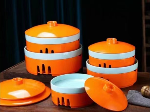 產品展示 1.密胺餐鍋:用于火鍋店快餐店燒烤店,材質采用A5密胺粉制做,可在零下30度到零上120度使用