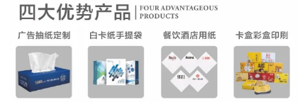 主要優(yōu)勢產(chǎn)品為: 廣告紙抽定制、白卡手提袋訂制印刷、餐飲酒店用紙、卡盒彩盒包裝印刷四大業(yè)務(wù)板塊!公司擁有先進(jìn)的進(jìn)口印刷設(shè)備和多臺印后工藝設(shè)備,并擁有10余條紙抽分切、折疊、包裝生產(chǎn)線和多臺餐巾紙印刷設(shè)備,所代理的原紙有:維達(dá)、太陽、銀鴿三大品牌,可滿足不同客戶訂單的需求!