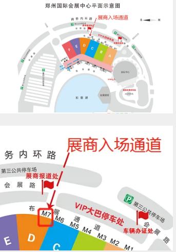 展商需前往鄭州國際會展中心后方物流通道 M7 號門“展商報到處”,辦理報到手續(xù),并領(lǐng)取《參展證件》后方可進(jìn)入展館。