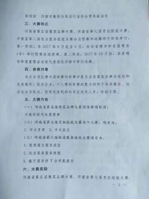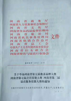 日前,河南省餐飲與飯店行業(yè)協(xié)會聯(lián)合河南省商務廳、河南省人力資源和社會保障廳、河南省文化廳、河南省食品藥品監(jiān)督管理局、河南省旅游局、河南省機關事務管理局、河南省供銷合作總社、河南省總工會、中國共產(chǎn)主義青年團河南省委員會、河南省婦女聯(lián)合會等10多家省級部門,發(fā)布了《關于舉辦河南省第五屆豫菜品牌大賽、河南省第七屆烹飪技能大賽、河南省第二屆飯店服務技能大賽的通知》。